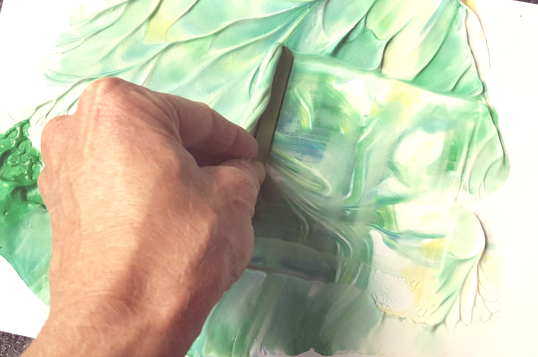 Squirt some shaving foam into the dish and smear around a bit. Add some drops of your favourite colours. Use the lolly stick (or fingers) to whizz the colours around in swirly patterns. Place a sheet of paper on top and press down. Remove the paper and use the side of the lolly stick to scrape off the excess foam. Underneath you will find a beautiful and completely unique marbled pattern!